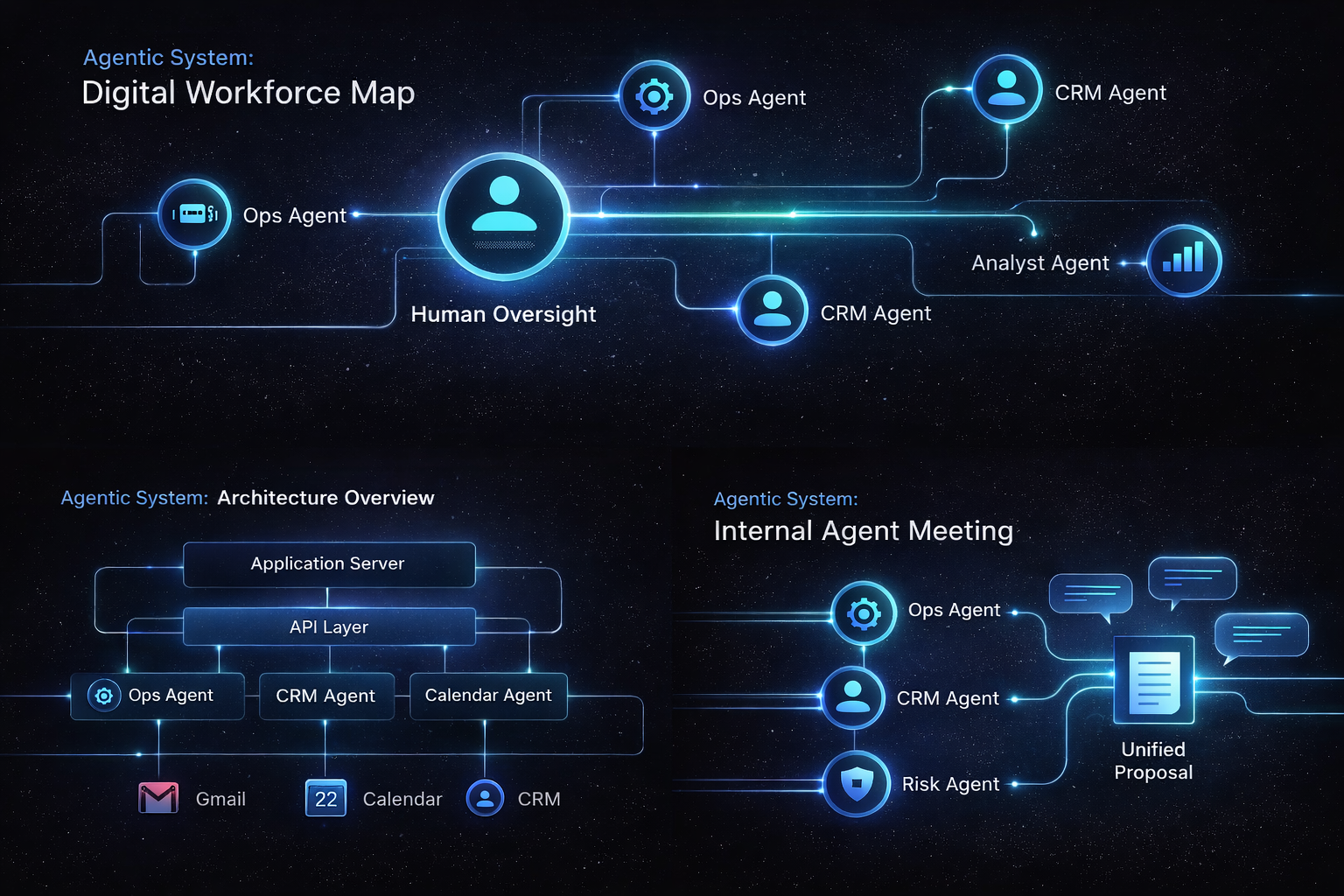 Each agent has its own identity. It may have its own email address, attend calendar meetings, access application servers via API, retrieve and update data, and escalate issues to humans.